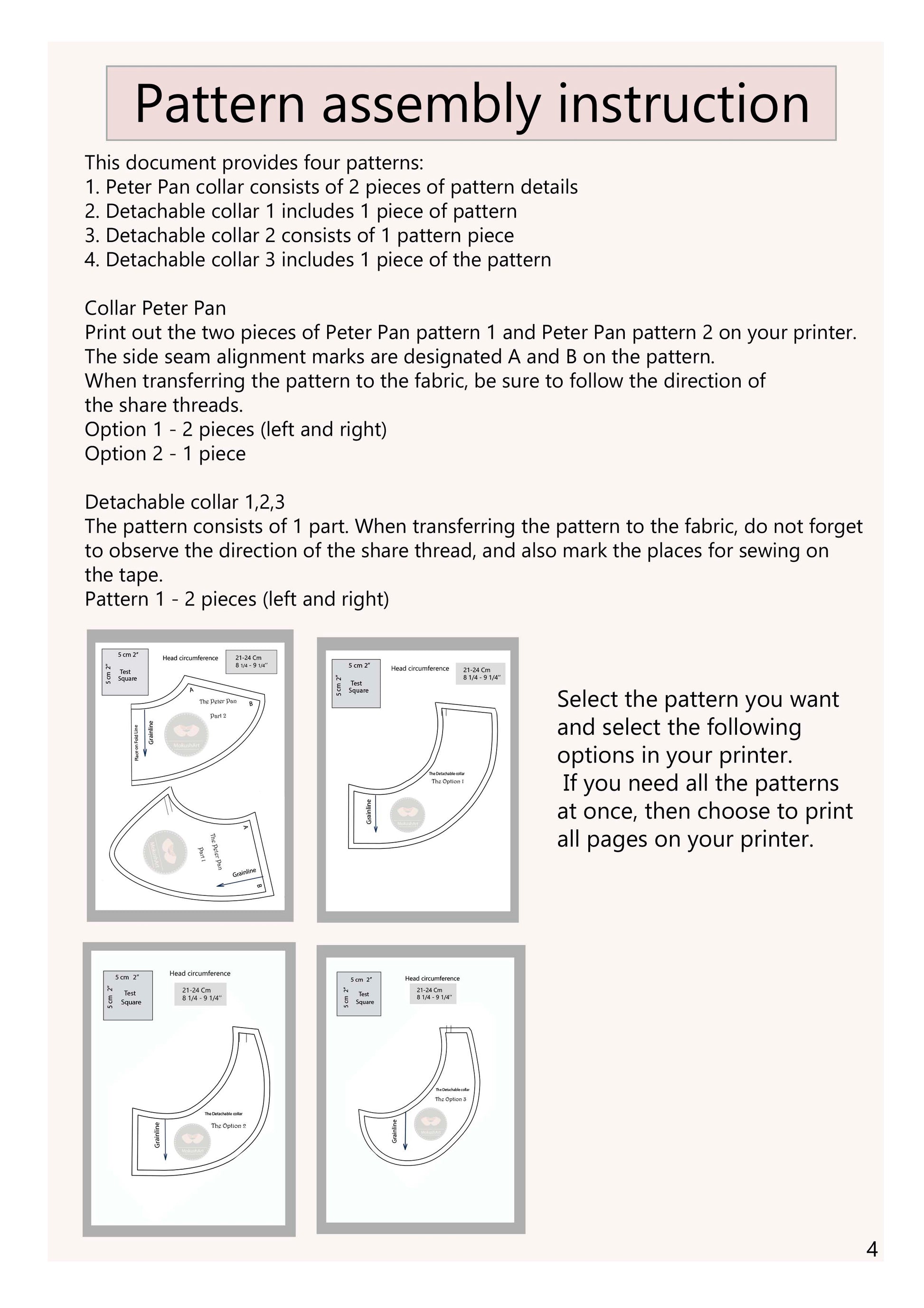 The file contains step-by-step instructions in English and 4 collar patterns.