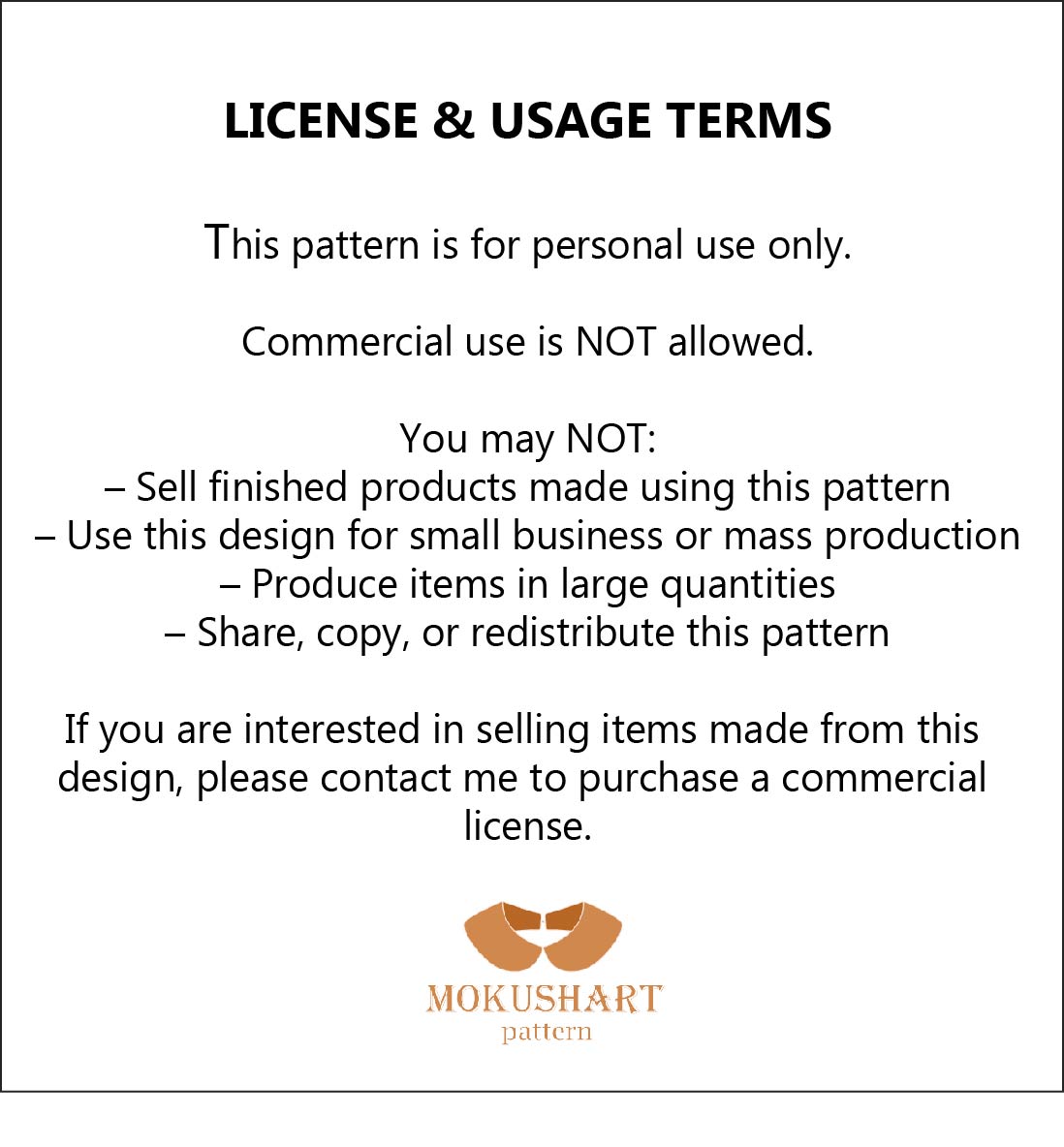 Copyright Notice: This pattern is an original design by MokushArt Studio. Your purchase grants you the right to use it for personal projects and small-batch handmade production. Redistribution or copying of the files is strictly prohibited.
